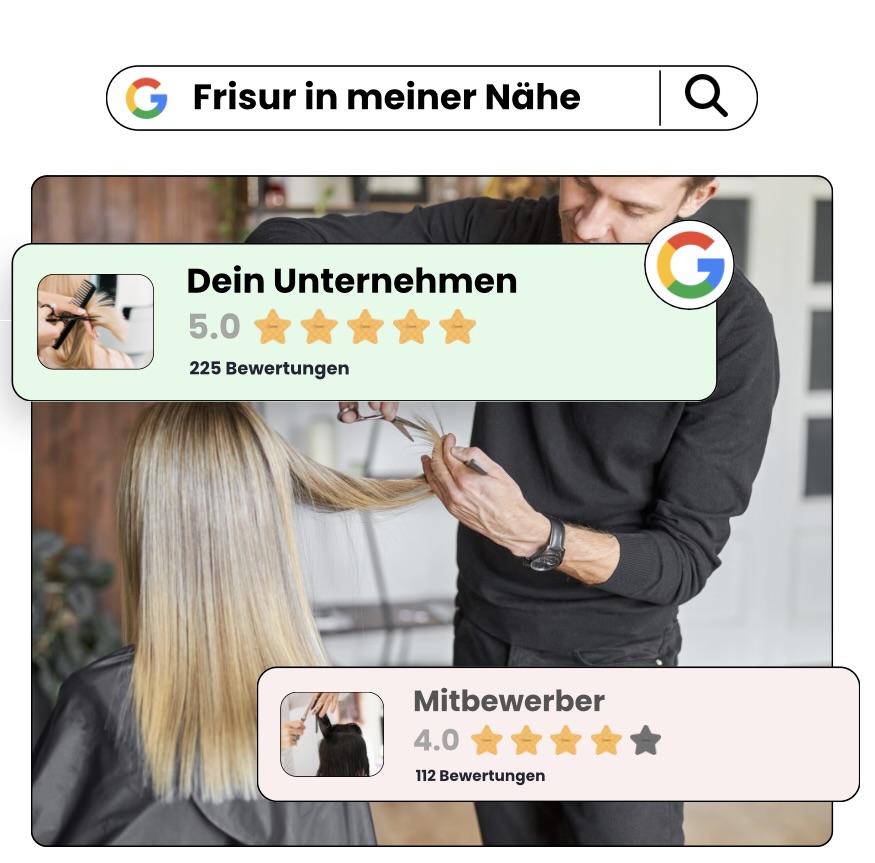 Unsere automatisiertes Google-Bewertungs-Tools sorgt dafür, dass zufriedene Kunden deine Meinung teilen – so wirst du sichtbarer und hebst dich von der Konkurrenz ab.